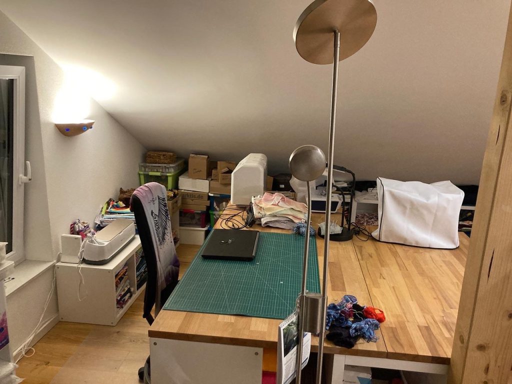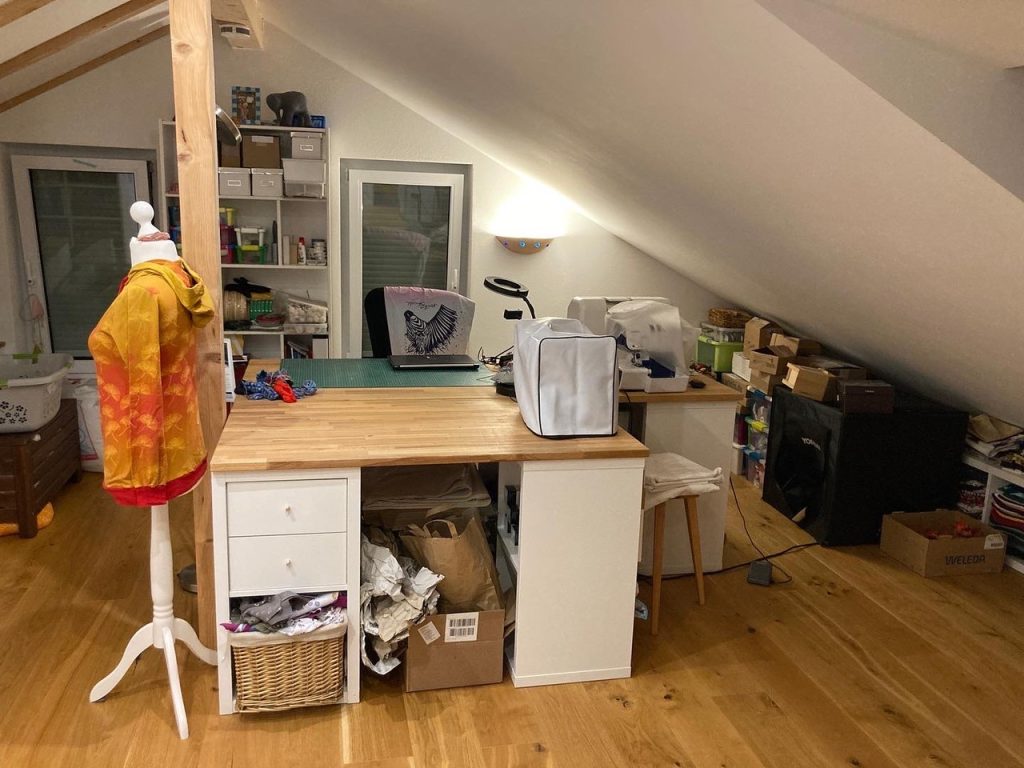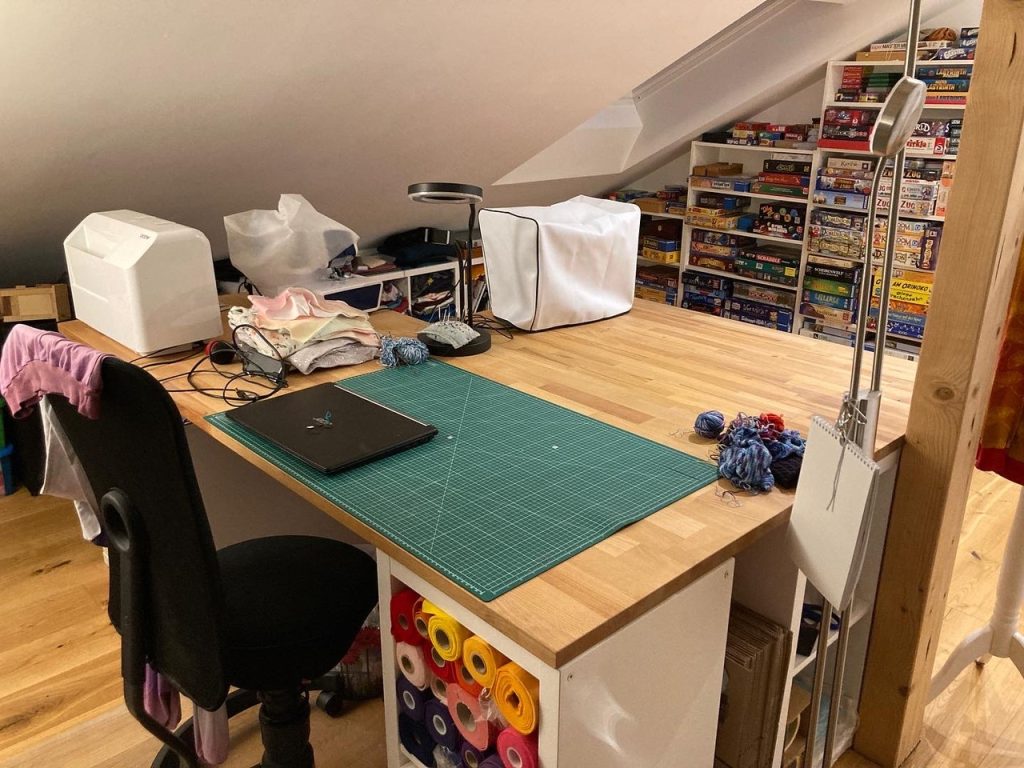 Alles fing damit an, dass meine Tochter ihr Zimmer umräumen und das Sofa gerne bei sich im Zimmer haben wollte. Das war meine Chance den Bereich um zu gestalten das Sideboard und das große Regal sind ins Büro gewandert und ich konnte meinen Nahbereich auf die andere des Raumes einrichten. Die beiden einzelplatten habe ich zu einer großen zusammen gestellt, darunter stehen einfache Kallax Regale. Jetzt habe ich einen schönen großen Tisch auf dem ich von allen Seiten arbeiten kann unsere ganzen Gesellschaftsspiele sind in die andere Ecke des Zimmers und so ist ein richtig schöner, großer Raum entstanden.