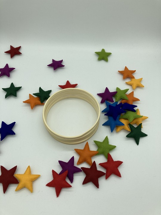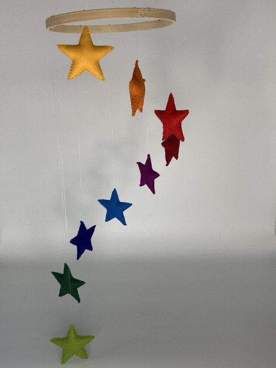Neue Sternenmobile in Regenbogenfarben sind entstanden. Die Sterne sind von Hand aus Filz genäht und mit Füllwatte ausgestopft und dann in Regenbogenfarben absteigend mit einem Nylonfaden an einem Holzring befestigt.