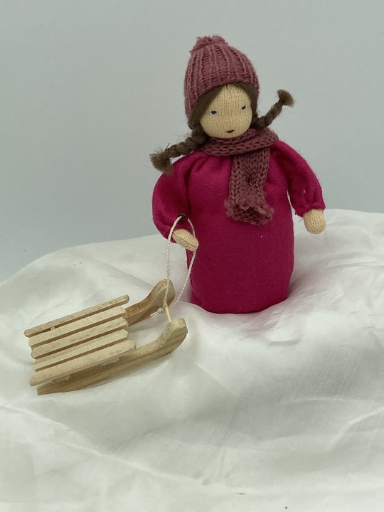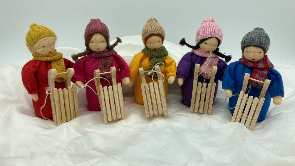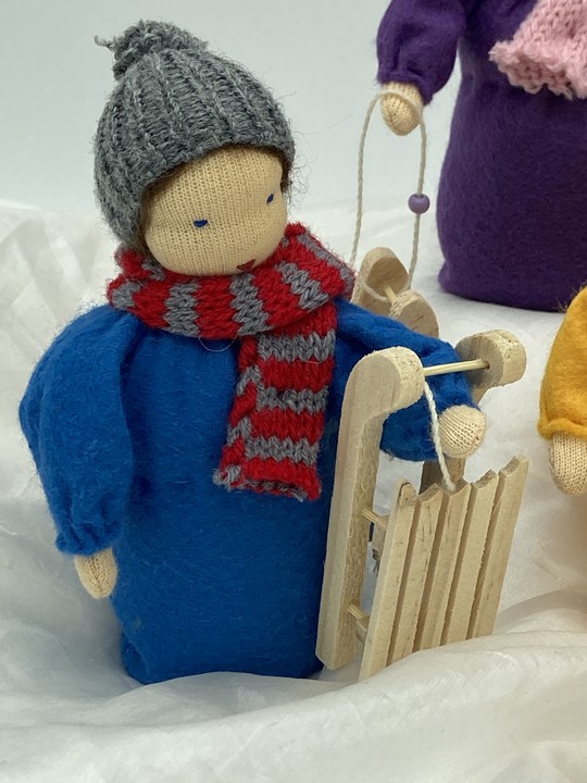 Meine Schlittenkinder sind in liebevoller Handarbeit aus Filz genäht und mit reiner süddeutscher Merinowolle ausgestopft. Sie sind ca. 10 cm groß und jedes Kind hat einen Schlitten den es hinter sich herziehen oder tragen kann.