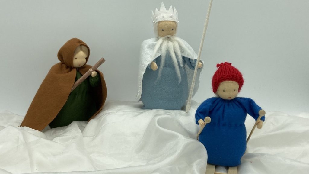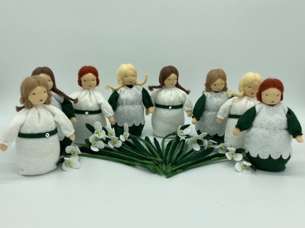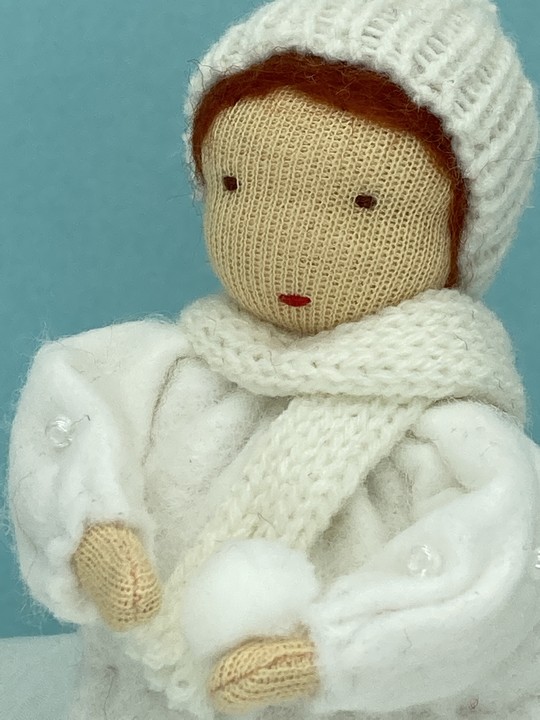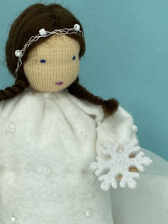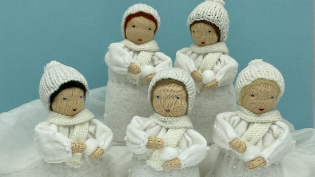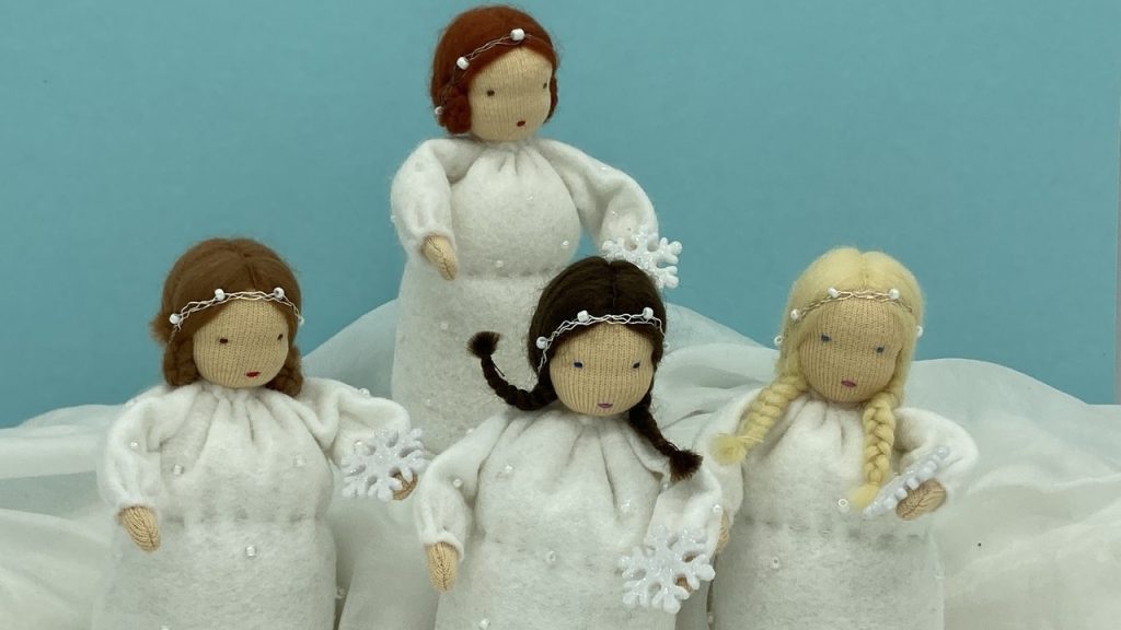 Ich gebe ja die Hoffnung nicht auf, das wir diesen Winter doch noch richtigen Schnee bekommen. Für den Jahreszeitentisch habe ich neue Schneemädchen mit einer Schneeflocke in der Hand. Sie sind mit glitzernden Perlen bestickt und haben einen silbernen Haarkranz mit weißen Perlen im Haar.