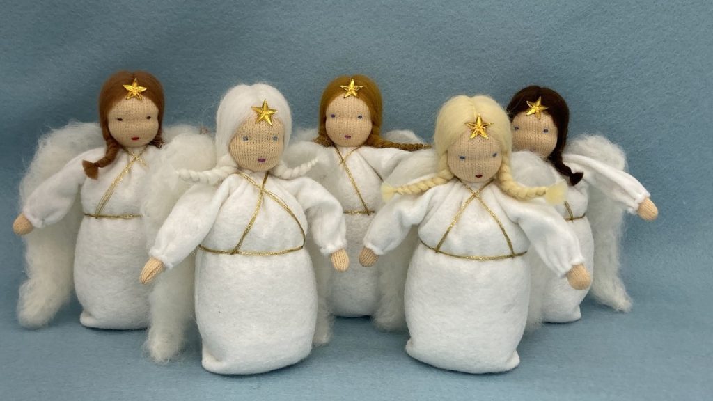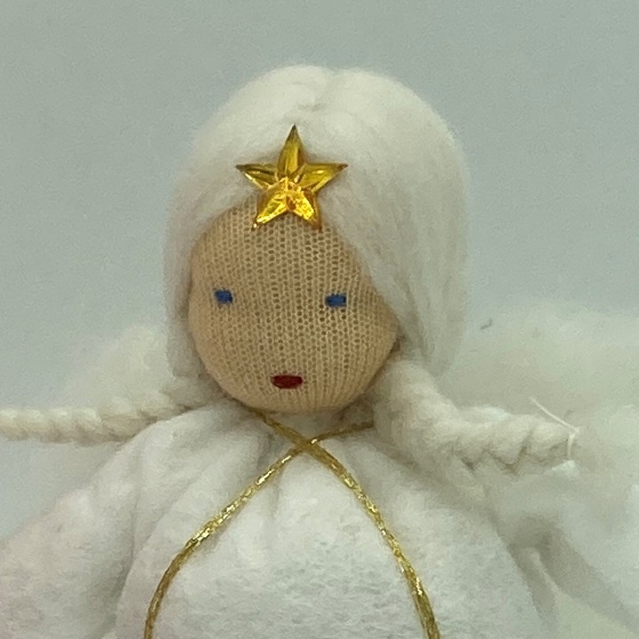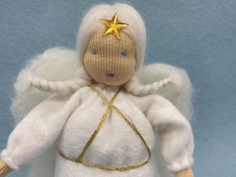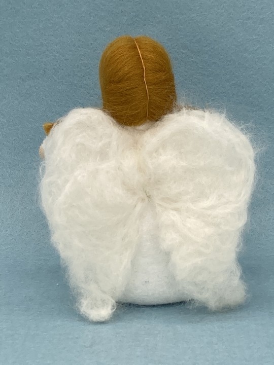 Die Schutzengel wurden von mir in liebevoller Handarbeit aus Filz genäht und mit reiner, süddeutscher Merinolle ausgestopft.Sie sind ca. 12 cm groß,. Die Flügel sind aus weißer, feiner Merinowolle gefilzt und an der Stirn ist ein goldener Stern befestigt. Ein goldens Band ziert das weiße Kleid.