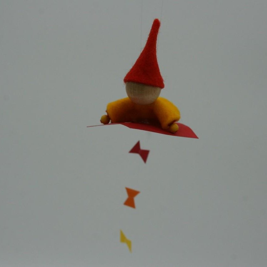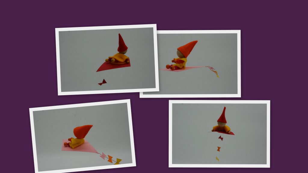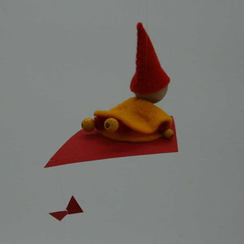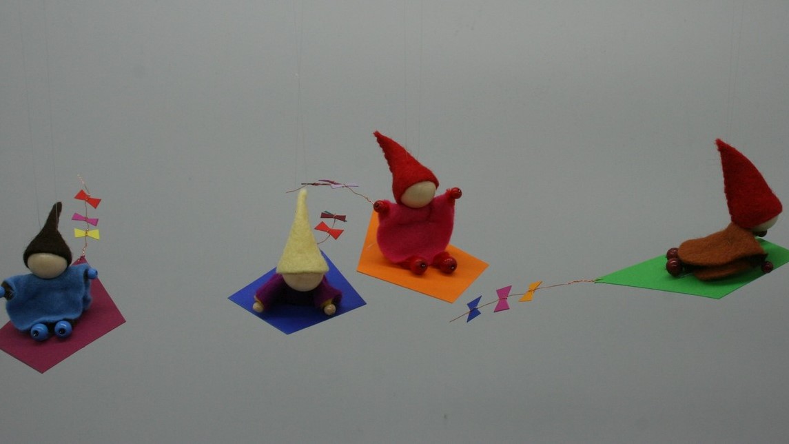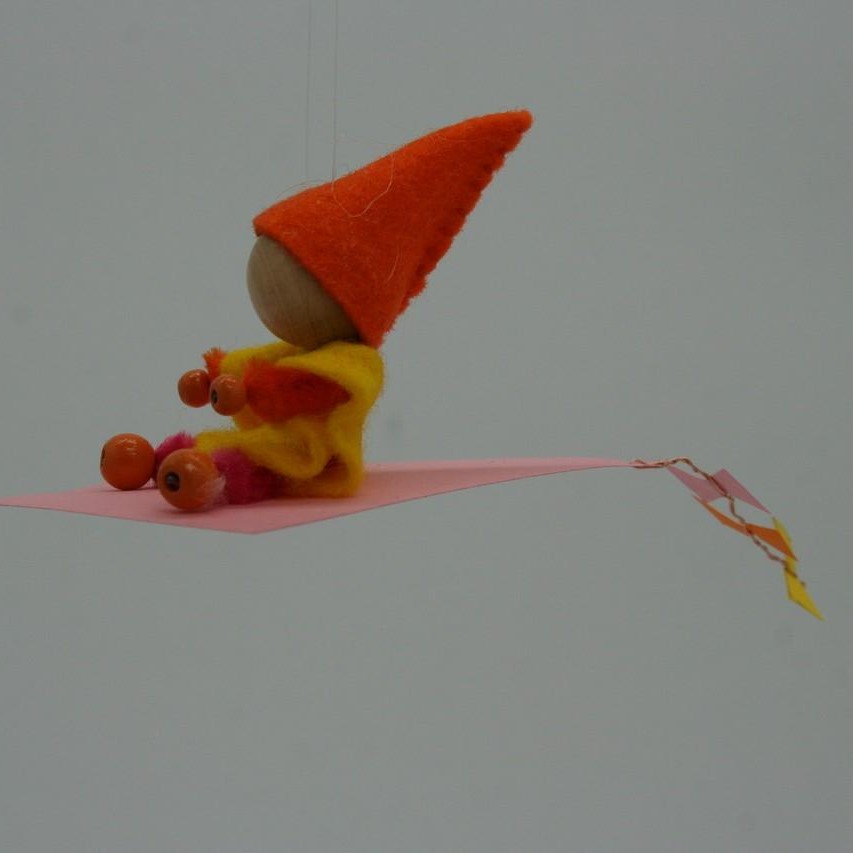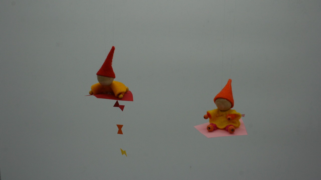 Die Männchen sitzen oder liegen auf einem kleinen Drachen aus Tonpapier welcher einen kleinen Schweif aus Draht mit kleinen Tonpapier Schleifchen hat.